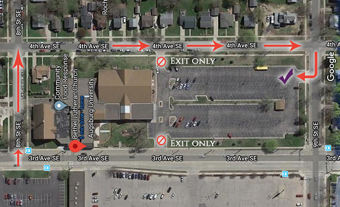 We ask that everyone remain in your vehicles. Please note the map below for traffic patterns in and out of the parking lot. Parking attendants will be present to guide you to your parking spot. We look forward to seeing you at Drive-In Worship with Holy Communion!